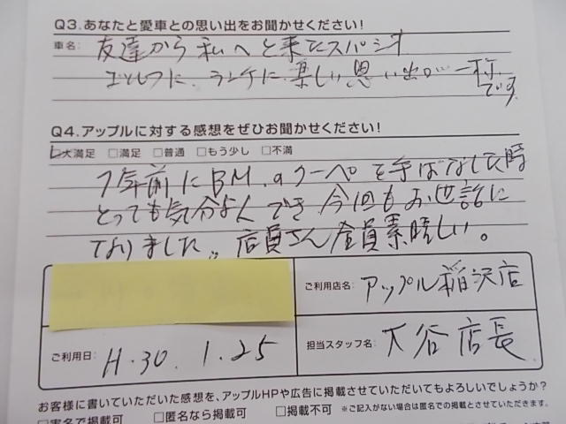 お車のご相談・ 査定だけでもOK! カンタン 入力 30秒 アップルがブランド買取始めました! お電話でも受付中! 受付時間10:00 ~ 19:00 0587-21-0040 お車のご相談・ 査定だけでもOK! カンタン 入力 30秒 アップルがブランド買取始めました! お電話でも受付中! 受付時間10:00 ~ 19:00 0587-21-0040 アップルがブランド買取始めました! お電話でも受付中! 受付時間10:00 ~ 19:00 0587-21-0040 店舗情報 在庫車 スタッフ紹介 ブログ お客様の声 キャンペーン 無料査定 click お客様の声 ご記入日: 2018/01/25 匿名様 1年前にBMのクーペを手ばなした時とっても気分よくでき、今回もお世話になりました。店員さん全員素晴しい。 前へ 次へ お客様の声一覧を見る