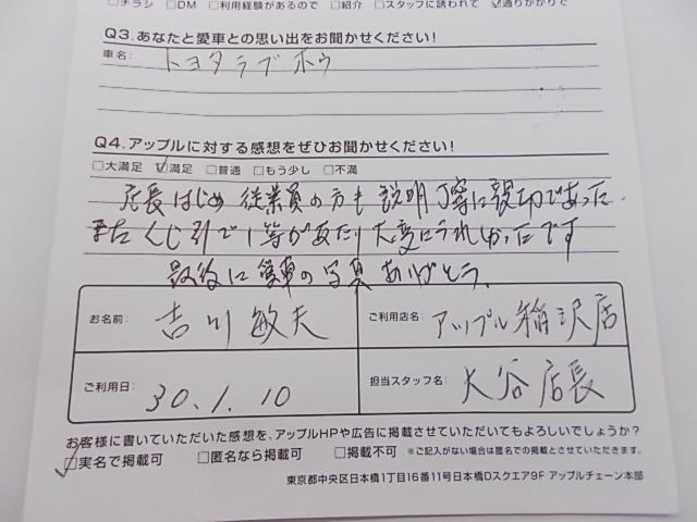 お車のご相談・ 査定だけでもOK! カンタン 入力 30秒 アップルがブランド買取始めました! お電話でも受付中! 受付時間10:00 ~ 19:00 0587-21-0040 お車のご相談・ 査定だけでもOK! カンタン 入力 30秒 アップルがブランド買取始めました! お電話でも受付中! 受付時間10:00 ~ 19:00 0587-21-0040 アップルがブランド買取始めました! お電話でも受付中! 受付時間10:00 ~ 19:00 0587-21-0040 店舗情報 在庫車 スタッフ紹介 ブログ お客様の声 キャンペーン 無料査定 click お客様の声 ご記入日: 2018/01/10 吉川敏夫様 店長はじめ従業員の方も説明丁寧に親切であった。またくじ引きで1等があたり大変にうれしかったです。最後に愛車の写真をありがとう。 前へ 次へ お客様の声一覧を見る