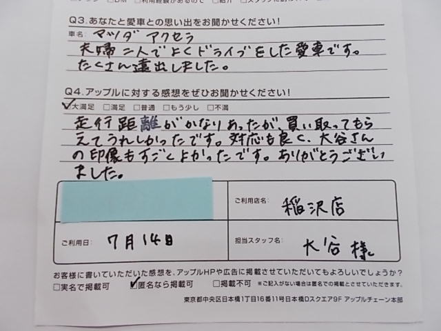 お車のご相談・ 査定だけでもOK! カンタン 入力 30秒 アップルがブランド買取始めました! お電話でも受付中! 受付時間10:00 ~ 19:00 0587-21-0040 お車のご相談・ 査定だけでもOK! カンタン 入力 30秒 アップルがブランド買取始めました! お電話でも受付中! 受付時間10:00 ~ 19:00 0587-21-0040 アップルがブランド買取始めました! お電話でも受付中! 受付時間10:00 ~ 19:00 0587-21-0040 店舗情報 在庫車 スタッフ紹介 ブログ お客様の声 キャンペーン 無料査定 click お客様の声 ご記入日: 2018/07/14 匿名様 走行距離がかなりあったが、買い取ってもらえてうれしかったです。対応も良く、大谷さんの印象もすごくよかったです。ありがとうございました。 前へ 次へ お客様の声一覧を見る
