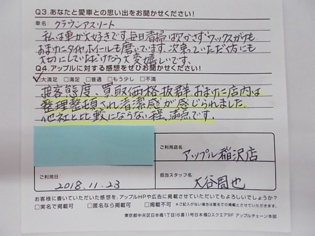 お車のご相談・ 査定だけでもOK! カンタン 入力 30秒 アップルがブランド買取始めました! お電話でも受付中! 受付時間10:00 ~ 19:00 0587-21-0040 お車のご相談・ 査定だけでもOK! カンタン 入力 30秒 アップルがブランド買取始めました! お電話でも受付中! 受付時間10:00 ~ 19:00 0587-21-0040 アップルがブランド買取始めました! お電話でも受付中! 受付時間10:00 ~ 19:00 0587-21-0040 店舗情報 在庫車 スタッフ紹介 ブログ お客様の声 キャンペーン 無料査定 click お客様の声 ご記入日: 2018/11/23 匿名様 接客態度、買取価格抜群、おまけに店内は整理整頓され清潔感が感じられました。他社と比較にならない程、満点です。 前へ 次へ お客様の声一覧を見る