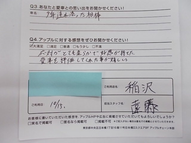 お車のご相談・ 査定だけでもOK! カンタン 入力 30秒 アップルがブランド買取始めました! お電話でも受付中! 受付時間10:00 ~ 19:00 0587-21-0040 お車のご相談・ 査定だけでもOK! カンタン 入力 30秒 アップルがブランド買取始めました! お電話でも受付中! 受付時間10:00 ~ 19:00 0587-21-0040 アップルがブランド買取始めました! お電話でも受付中! 受付時間10:00 ~ 19:00 0587-21-0040 店舗情報 在庫車 スタッフ紹介 ブログ お客様の声 キャンペーン 無料査定 click お客様の声 ご記入日: 2018/10/15 匿名様 応対がとても柔らかで好感が持てた。愛車を評価してくれた事が嬉しい。 前へ 次へ お客様の声一覧を見る