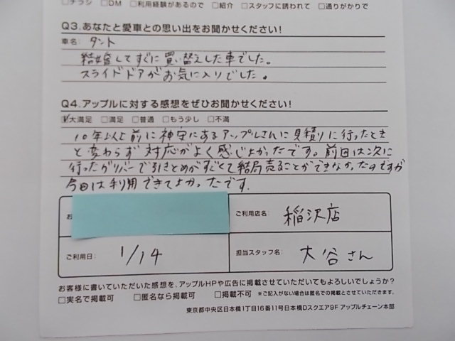 愛知県稲沢市 匿名様 車名:ダイハツ タント
