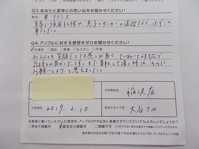 お車のご相談・ 査定だけでもOK! カンタン 入力 30秒 アップルがブランド買取始めました! お電話でも受付中! 受付時間10:00 ~ 19:00 0587-21-0040 お車のご相談・ 査定だけでもOK! カンタン 入力 30秒 アップルがブランド買取始めました! お電話でも受付中! 受付時間10:00 ~ 19:00 0587-21-0040 アップルがブランド買取始めました! お電話でも受付中! 受付時間10:00 ~ 19:00 0587-21-0040 店舗情報 在庫車 スタッフ紹介 ブログ お客様の声 キャンペーン 無料査定 click お客様の声 ご記入日: 2019/02/10 匿名様 車名:トヨタ アイシス お二人とも笑顔でとても感じか良く、ていねいな対応で気持ちが良かったです。また買取して頂くときはこちらにお願いしようと思えました。 前へ 次へ お客様の声一覧を見る