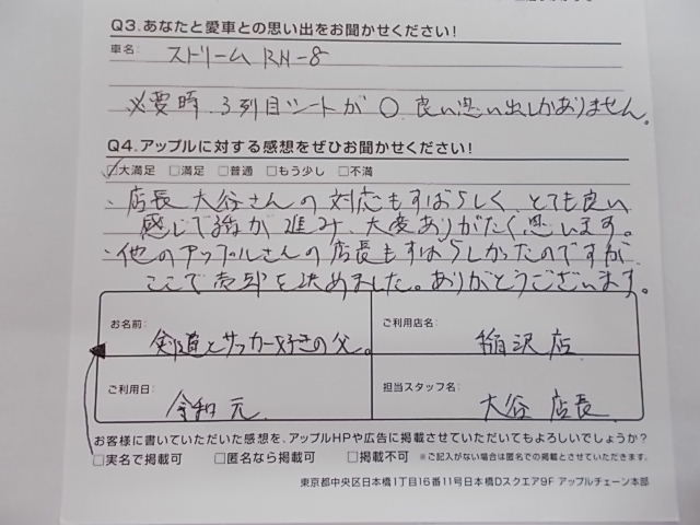 お車のご相談・ 査定だけでもOK! カンタン 入力 30秒 アップルがブランド買取始めました! お電話でも受付中! 受付時間10:00 ~ 19:00 0587-21-0040 お車のご相談・ 査定だけでもOK! カンタン 入力 30秒 アップルがブランド買取始めました! お電話でも受付中! 受付時間10:00 ~ 19:00 0587-21-0040 アップルがブランド買取始めました! お電話でも受付中! 受付時間10:00 ~ 19:00 0587-21-0040 店舗情報 在庫車 スタッフ紹介 ブログ お客様の声 キャンペーン 無料査定 click お客様の声 ご記入日: 2019/09/06 剣道とサッカー好きの父。様 車名:ホンダ ストリーム 店長大谷さんの対応もすばらしく、とても良い感じで話が進み、大変ありがたく思います。他のアップルさんの店長も素晴らしかったのですが、ここで売却を決めました。ありがとうございます。 前へ 次へ お客様の声一覧を見る