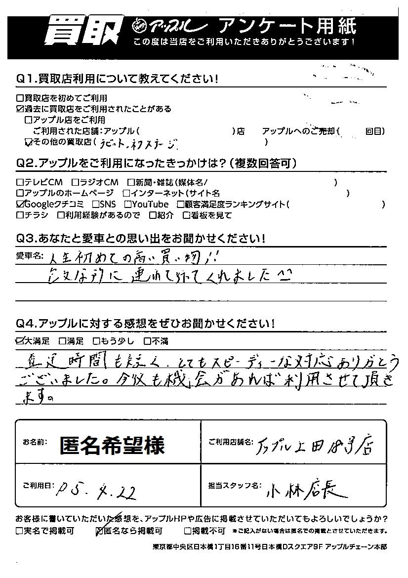 査定時間も短く、とてもスピーディーな対応ありがとうございました。