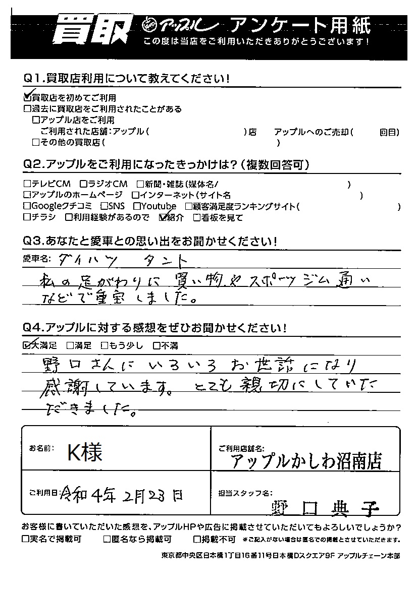 お車のご相談・ 査定だけでもOK! カンタン 入力 30秒 アップルがブランド買取始めました! お電話でも受付中! 受付時間10:00 ~ 19:00 04-7190-1500 お車のご相談・ 査定だけでもOK! カンタン 入力 30秒 アップルがブランド買取始めました! お電話でも受付中! 受付時間10:00 ~ 19:00 04-7190-1500 アップルがブランド買取始めました! お電話でも受付中! 受付時間10:00 ~ 19:00 04-7190-1500 店舗情報 在庫車 スタッフ紹介 ブログ お客様の声 キャンペーン お得 無料査定 click お客様の声 ご記入日: 2022/02/23 K様 車名:ダイハツ タント Q あなたと愛車との思い出をお聞かせください!私の足がわりに買い物やスポーツジム通いなどで重宝しました。Q アップルに対する感想をぜひお聞かせください!感想:大満足野口さんにいろいろお世話になり感謝しています。とても親切にしていただきました。 前へ 次へ お客様の声一覧を見る