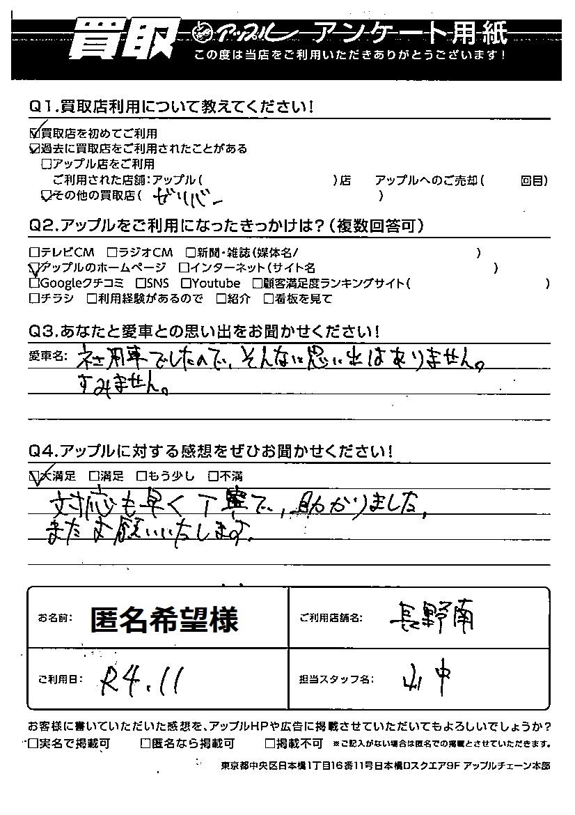 お車のご相談・ 査定だけでもOK! カンタン 入力 30秒 アップルがブランド買取始めました! お電話でも受付中! 受付時間10:00 ~ 19:00 026-293-6300 お車のご相談・ 査定だけでもOK! カンタン 入力 30秒 アップルがブランド買取始めました! お電話でも受付中! 受付時間10:00 ~ 19:00 026-293-6300 アップルがブランド買取始めました! お電話でも受付中! 受付時間10:00 ~ 19:00 026-293-6300 店舗情報 在庫車 スタッフ紹介 ブログ お客様の声 キャンペーン 無料査定 click お客様の声 ご記入日: 2023/02/10 匿名希望様 ご利用日:2022年11月社用車でしたので、そんなに思い出はありません。すみません。対応速く 、丁寧で助かりました。またお願い致します。 前へ 次へ お客様の声一覧を見る