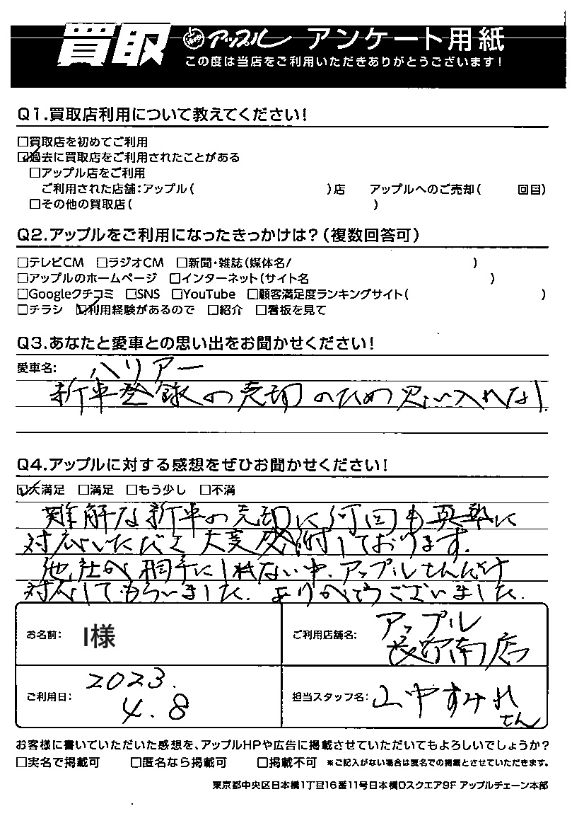 Q:難解な新車売却に何回も真摯に対応頂き、大変感謝してお