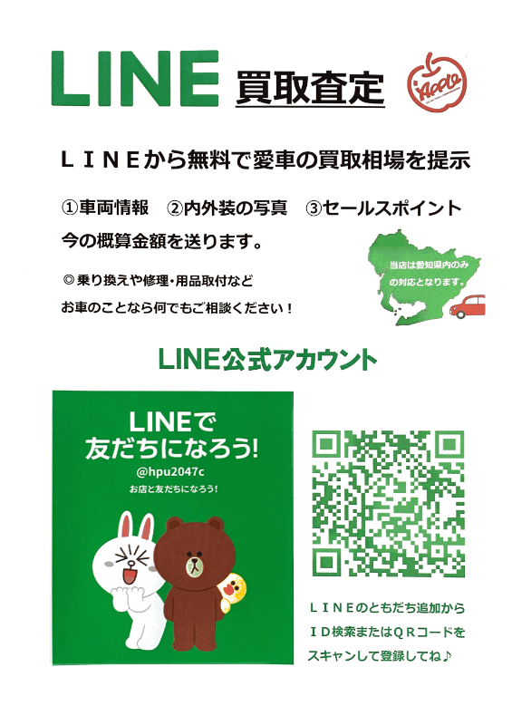 お車のご相談・ 査定だけでもOK! カンタン 入力 30秒 アップルがブランド買取始めました! お電話でも受付中! 受付時間10:00~19:30 0562-91-0500 お車のご相談・ 査定だけでもOK! カンタン 入力 30秒 アップルがブランド買取始めました! お電話でも受付中! 受付時間10:00~19:30 0562-91-0500 アップルがブランド買取始めました! お電話でも受付中! 受付時間10:00~19:30 0562-91-0500 店舗情報 在庫車 スタッフ紹介 ブログ お客様の声 キャンペーン お得 無料査定 click [ 未分類 ] 2020/04/17 (金) 13:10 ◎自宅でかんたんLINE査定 2020-04-17 13:10:45 新しい記事へ 古い記事へ 最新記事 ★クリスマスツリー★DAMDジムニー コンプリート取り扱い★Wプレゼントキャンペーン★夏季休暇のお知らせ★2023新春初売り★ 店舗情報に戻る 月別アーカイブ 2024年11月(1)2023年11月(1)2023年08月(2)2022年12月(1)2022年11月(1)2022年01月(1)2021年12月(2)2021年09月(1)2021年07月(1)2021年02月(1)2021年01月(2)2020年04月(4)2019年10月(1)2019年08月(1)2019年07月(1)