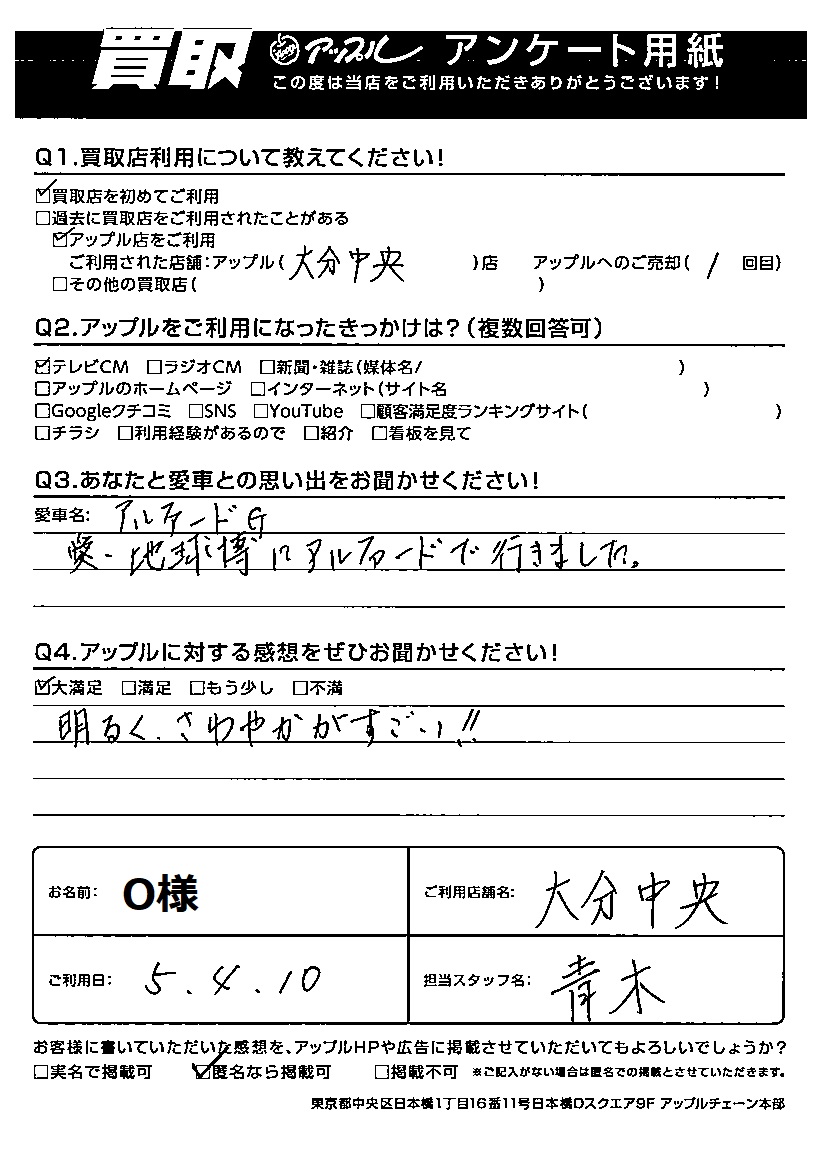 O 様 ご愛車:トヨタ アルファードG 担当:青木