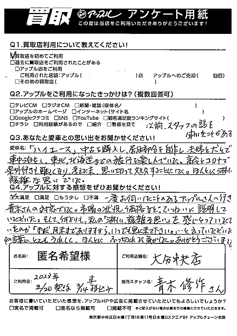 匿名希望 様 ご愛車:トヨタ ハイエース 担当:青木
