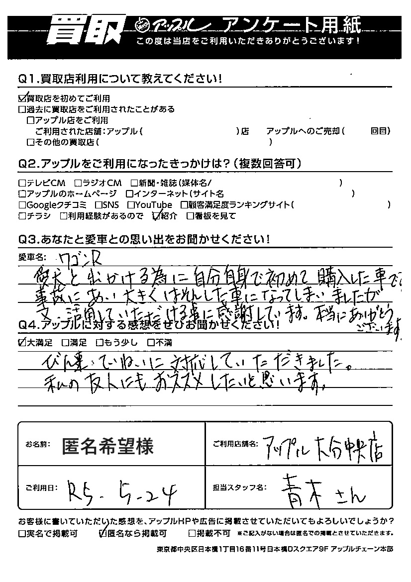 匿名希望 様 ご愛車:スズキ ワゴンR 担当:青木