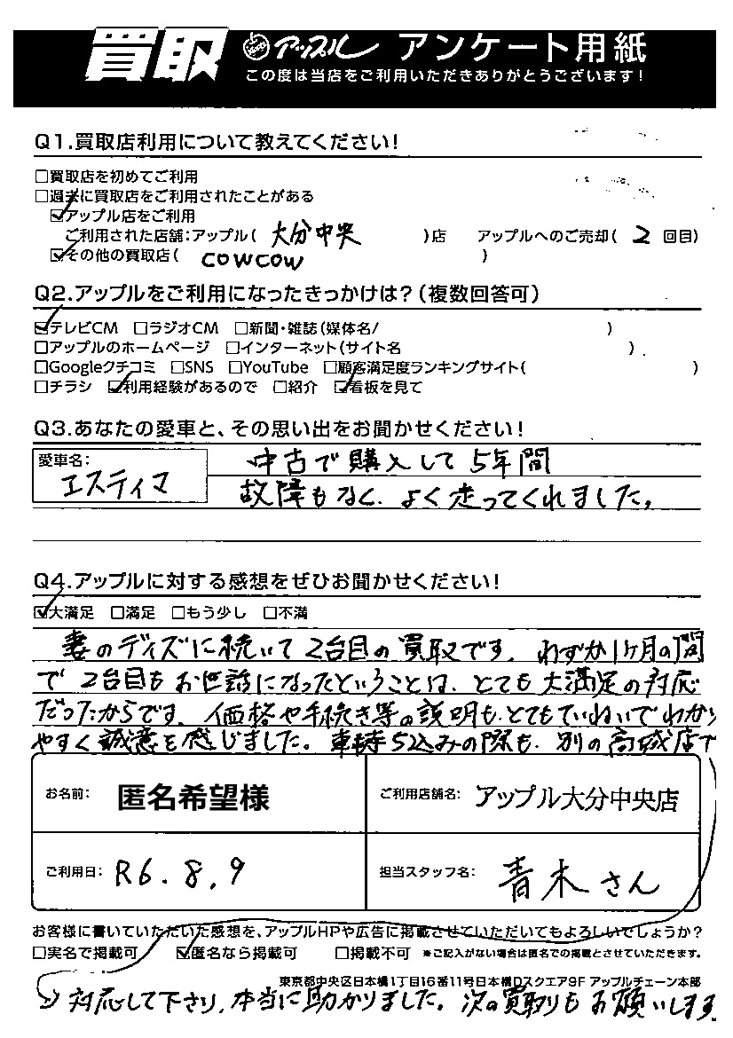 匿名希望 様 担当:青木