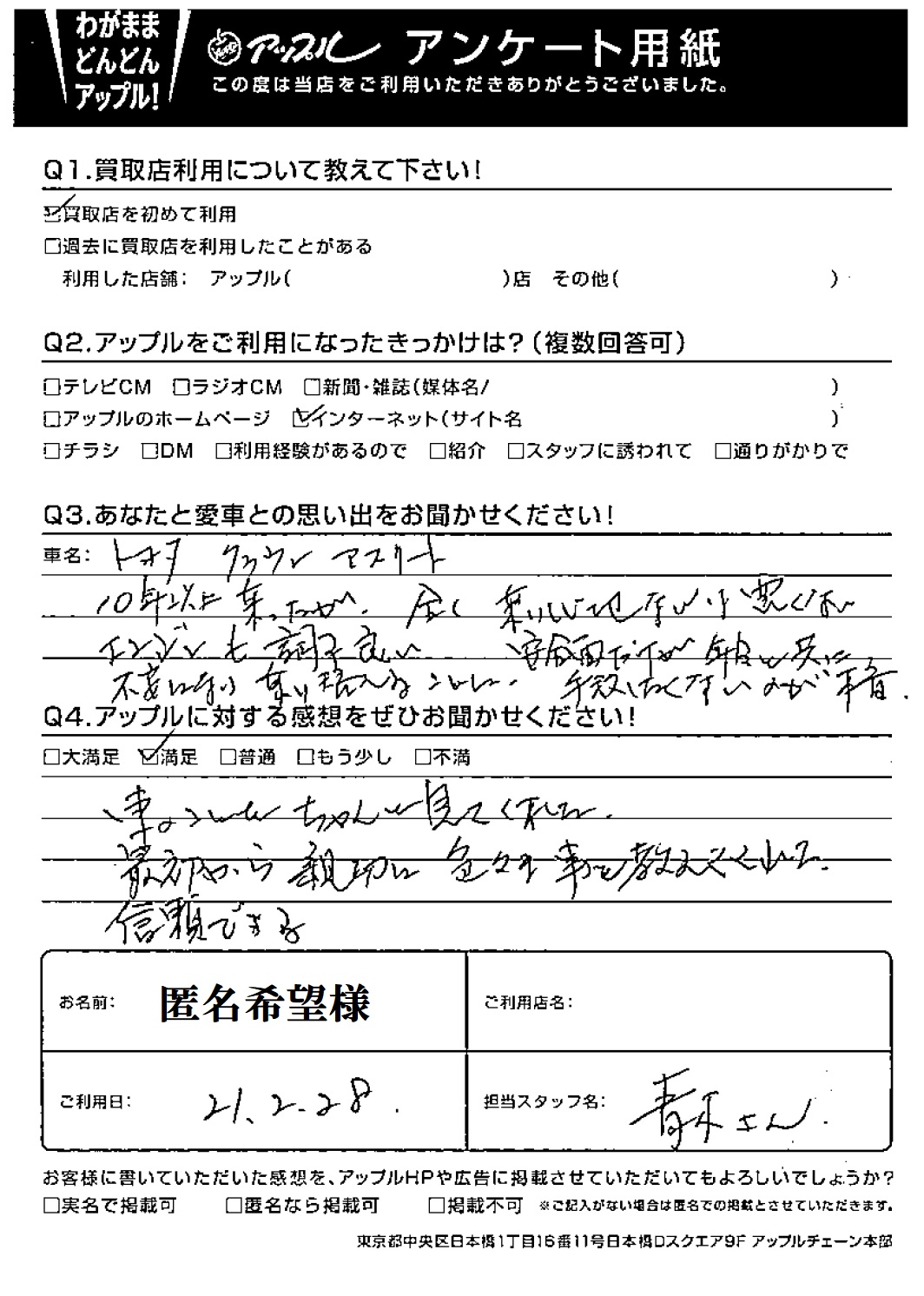匿名希望様 車名:トヨタ クラウンアスリート (H11年9月~H30年6月)