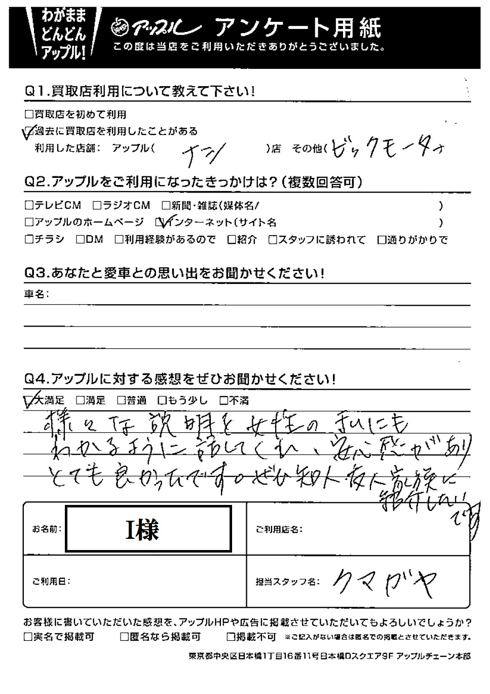 お車のご相談・ 査定だけでもOK! カンタン 入力 30秒 アップルがブランド買取始めました! お電話でも受付中! 受付時間10:00 ~ 19:00 0120-28-1688 お車のご相談・ 査定だけでもOK! カンタン 入力 30秒 アップルがブランド買取始めました! お電話でも受付中! 受付時間10:00 ~ 19:00 0120-28-1688 アップルがブランド買取始めました! お電話でも受付中! 受付時間10:00 ~ 19:00 0120-28-1688 店舗情報 在庫車 スタッフ紹介 ブログ お客様の声 キャンペーン 無料査定 click お客様の声 ご記入日: 2021/03/01 I様 Q アップルに対する感想をぜひお聞かせください!感想:大満足様々な説明を女性の私にもわかるように話してくれ、安心感がありとても良かったです。ぜひ知人、友人、家族に紹介したいです。 前へ 次へ お客様の声一覧を見る