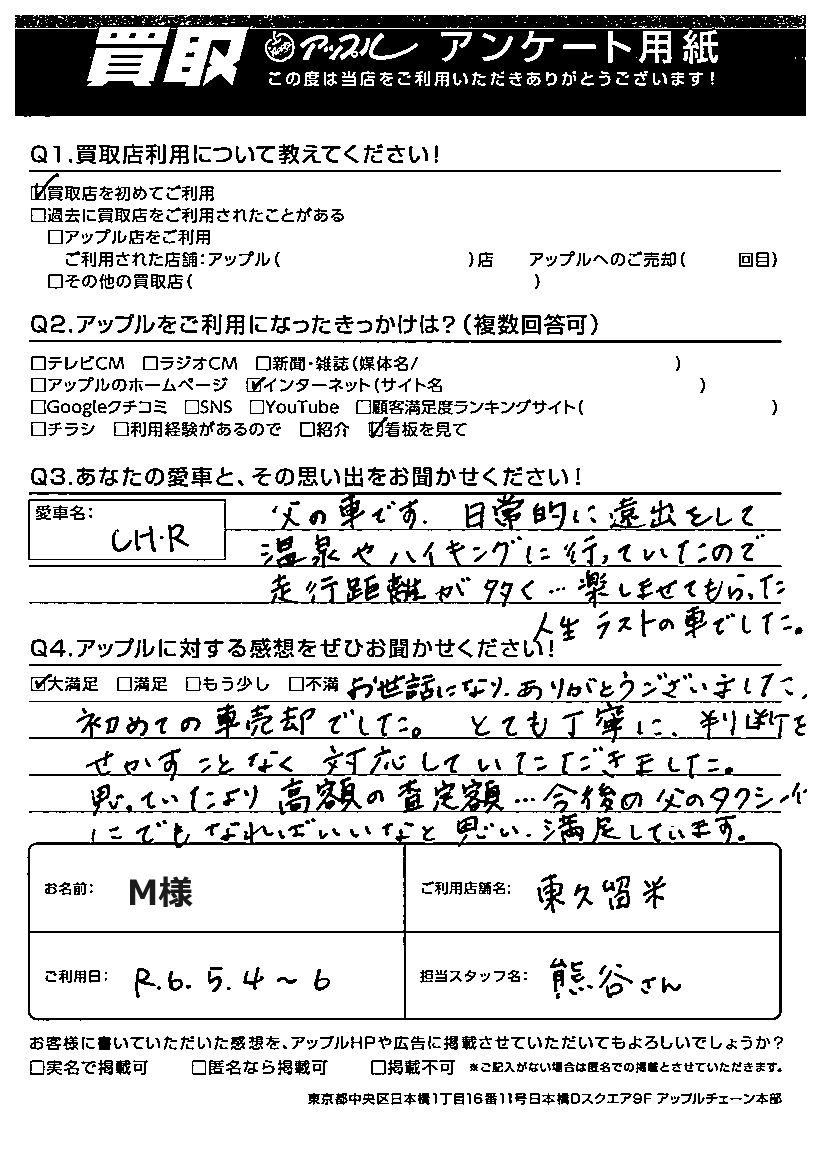 初めての車売却でした。とても丁寧に、判断をせかすことなく対応