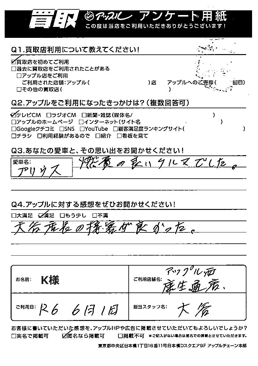 K様 車名:トヨタ プリウス(2023年3月~のPHVを含む)