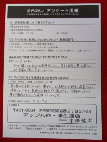 アップル西康生通店より:弟様のご紹介でご来店頂きありがとうございます!息子様の成長を共にした大切なお車のご売却に当店を選んで頂き嬉しいです!今後とも長いお付き合いお願い致します!