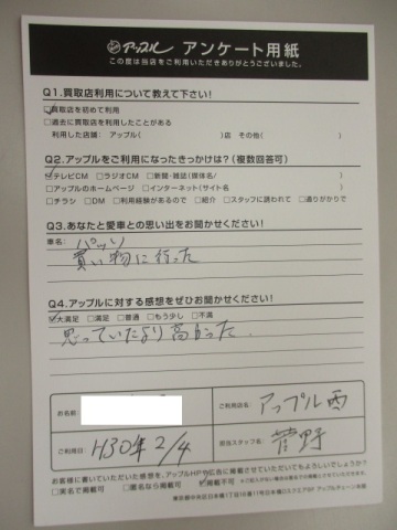 お車のご相談・ 査定だけでもOK! カンタン 入力 30秒 アップルがブランド買取始めました! お電話でも受付中! 受付時間 10:00 ~ 19:00 052-528-5335 お車のご相談・ 査定だけでもOK! カンタン 入力 30秒 アップルがブランド買取始めました! お電話でも受付中! 受付時間 10:00 ~ 19:00 052-528-5335 アップルがブランド買取始めました! お電話でも受付中! 受付時間 10:00 ~ 19:00 052-528-5335 店舗情報 在庫車 スタッフ紹介 ブログ お客様の声 キャンペーン お得 無料査定 click お客様の声 ご記入日: 2018/02/04 匿名様 車名 パッソ思い出 買い物に行った感想 思っていたより高かった。 前へ 次へ お客様の声一覧を見る