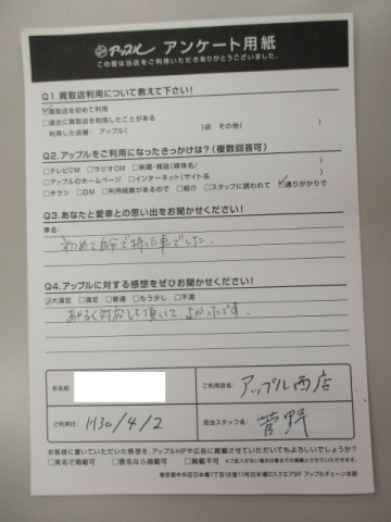 お車のご相談・ 査定だけでもOK! カンタン 入力 30秒 アップルがブランド買取始めました! お電話でも受付中! 受付時間 10:00 ~ 19:00 052-528-5335 お車のご相談・ 査定だけでもOK! カンタン 入力 30秒 アップルがブランド買取始めました! お電話でも受付中! 受付時間 10:00 ~ 19:00 052-528-5335 アップルがブランド買取始めました! お電話でも受付中! 受付時間 10:00 ~ 19:00 052-528-5335 店舗情報 在庫車 スタッフ紹介 ブログ お客様の声 キャンペーン お得 無料査定 click お客様の声 ご記入日: 2018/04/02 匿名様 愛車 フィット思い出 初めて自分で持った車でした。感想 あかるく対応して頂いてよかったです。 前へ 次へ お客様の声一覧を見る