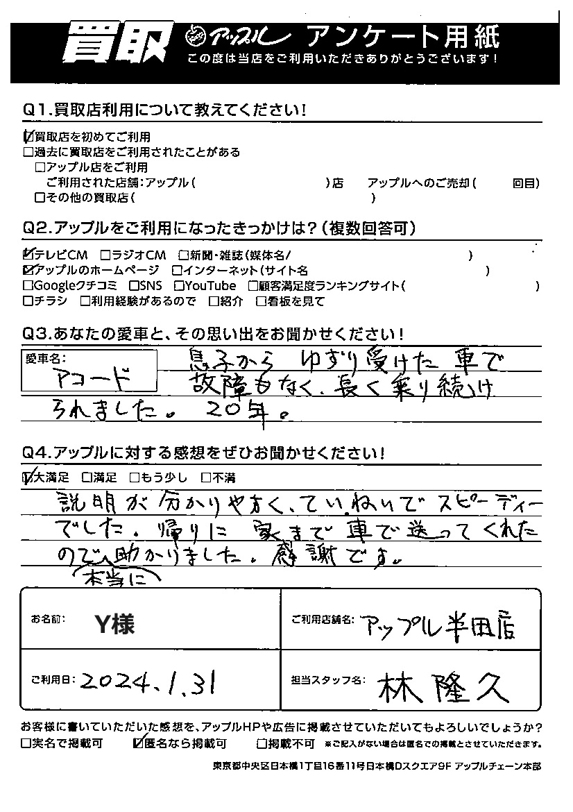 Y様 車名:ホンダ アコードセダン(H28年5月~のHYBRID含む)
