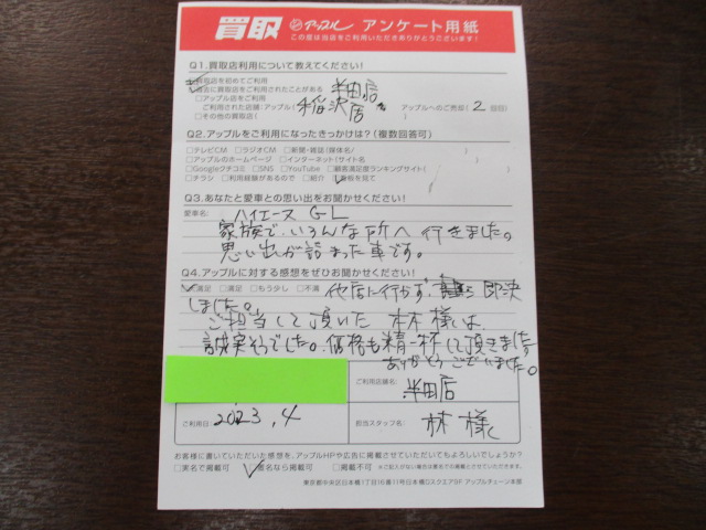 他店に行かず即決しました。担当して頂いた林様は、誠実そうでした。