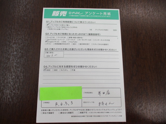 お車のご相談・ 査定だけでもOK! カンタン 入力 30秒 アップルがブランド買取始めました! お電話でも受付中! 受付時間10:00 ~ 19:00 0569-32-3211 お車のご相談・ 査定だけでもOK! カンタン 入力 30秒 アップルがブランド買取始めました! お電話でも受付中! 受付時間10:00 ~ 19:00 0569-32-3211 アップルがブランド買取始めました! お電話でも受付中! 受付時間10:00 ~ 19:00 0569-32-3211 店舗情報 在庫車 スタッフ紹介 ブログ お客様の声 キャンペーン 無料査定 click お客様の声 ご記入日: 2024/03/03 U様 車名:ルノー カングー 今回は、ルノー・カングーを購入頂きありがとうございました。Uさま、ぜひ次回はコメント宜しくお願いします。 林 前へ 次へ お客様の声一覧を見る
