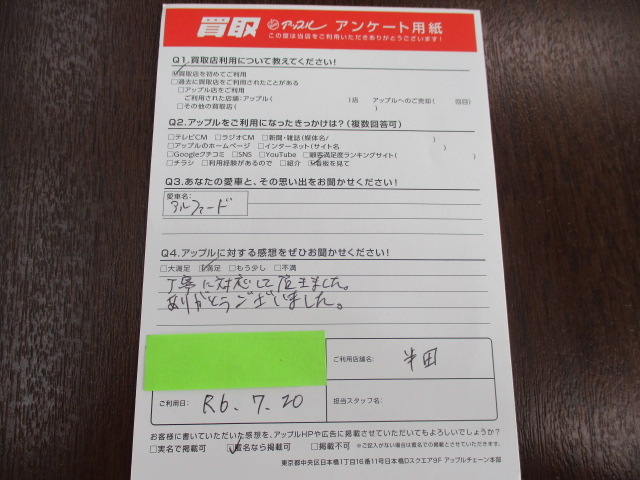 Aこちらこそありがとうございました。査定から少し時間があいて車が納車されるから