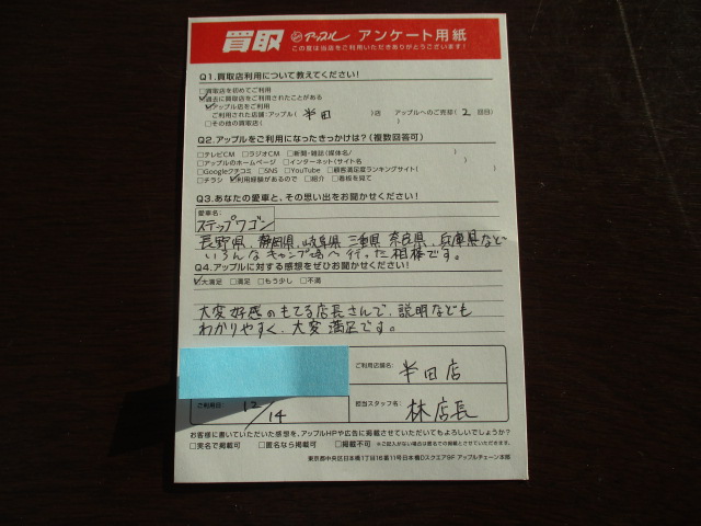 A 今回もご利用いただきありがとうございます。遠くのキャンプ場までお出掛けになっていたんですね。新しいお車もステップワゴンなので、たくさんお出かけになってまた多くの思い出を作ってくださいね。次回のご利用お待ちしております。宜しくお願いします。