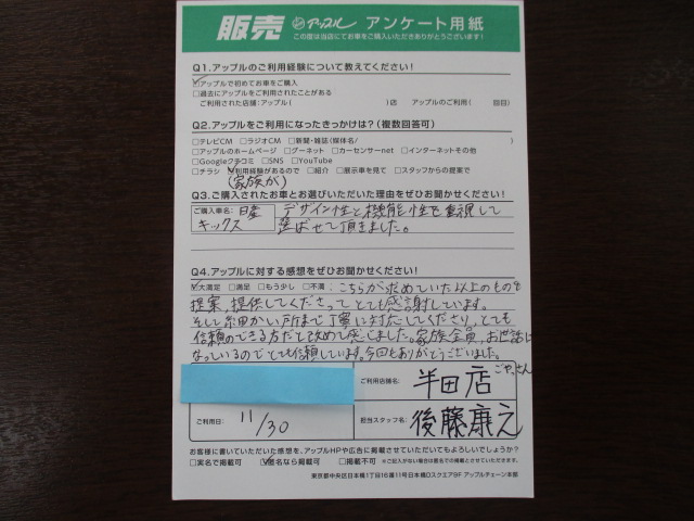 先日はキックスをお買い上げ頂きありがとうございました。