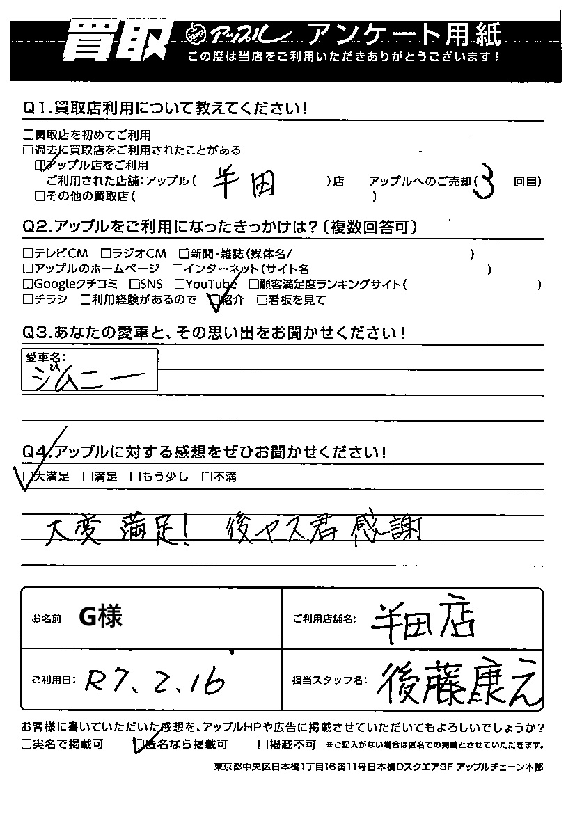 お車のご相談・ 査定だけでもOK! カンタン 入力 30秒 アップルがブランド買取始めました! お電話でも受付中! 受付時間10:00 ~ 19:00 0569-32-3211 お車のご相談・ 査定だけでもOK! カンタン 入力 30秒 アップルがブランド買取始めました! お電話でも受付中! 受付時間10:00 ~ 19:00 0569-32-3211 アップルがブランド買取始めました! お電話でも受付中! 受付時間10:00 ~ 19:00 0569-32-3211 店舗情報 在庫車 スタッフ紹介 ブログ お客様の声 キャンペーン 無料査定 click お客様の声 ご記入日: 2025/02/16 G様 車名:スズキ ジムニー 【アップルに対する感想をぜひお聞かせ下さい!】大満足!大変満足!後ヤス君感謝担当:後藤 前へ 次へ お客様の声一覧を見る