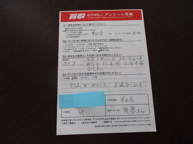 お車のご相談・ 査定だけでもOK! カンタン 入力 30秒 アップルがブランド買取始めました! お電話でも受付中! 受付時間10:00 ~ 19:00 0569-32-3211 お車のご相談・ 査定だけでもOK! カンタン 入力 30秒 アップルがブランド買取始めました! お電話でも受付中! 受付時間10:00 ~ 19:00 0569-32-3211 アップルがブランド買取始めました! お電話でも受付中! 受付時間10:00 ~ 19:00 0569-32-3211 店舗情報 在庫車 スタッフ紹介 ブログ お客様の声 キャンペーン 無料査定 click お客様の声 ご記入日: 2025/02/01 知多郡 K様 車名:日産 リーフ アップルに対する感想をぜひお聞かせください。 対応がやさしく、不満ないです。 前へ 次へ お客様の声一覧を見る