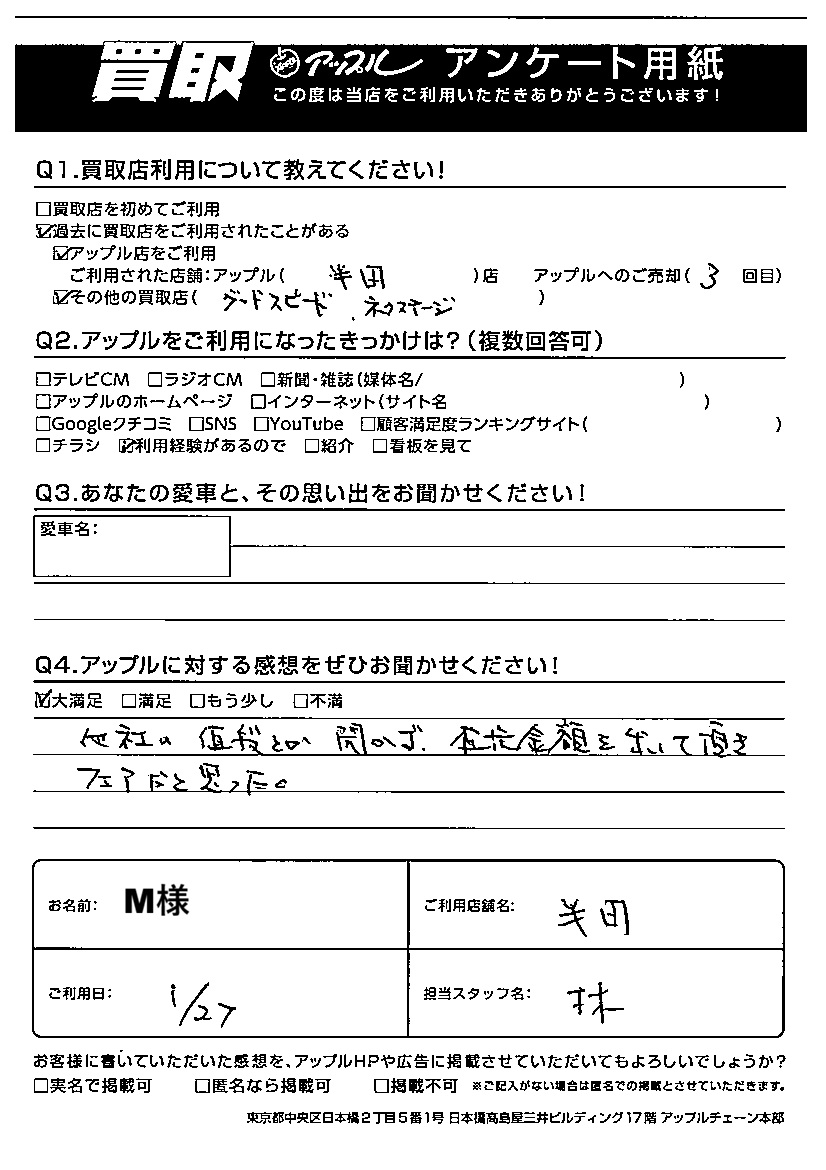 お車のご相談・ 査定だけでもOK! カンタン 入力 30秒 アップルがブランド買取始めました! お電話でも受付中! 受付時間10:00 ~ 19:00 0569-32-3211 お車のご相談・ 査定だけでもOK! カンタン 入力 30秒 アップルがブランド買取始めました! お電話でも受付中! 受付時間10:00 ~ 19:00 0569-32-3211 アップルがブランド買取始めました! お電話でも受付中! 受付時間10:00 ~ 19:00 0569-32-3211 店舗情報 在庫車 スタッフ紹介 ブログ お客様の声 キャンペーン 無料査定 click お客様の声 ご記入日: 2026/01/27 M様 【アップルに対する感想をぜひお聞かせ下さい!】大満足!他社の値段とか聞かず、査定金額を出して頂きフェアだと思った。担当:林 前へ 次へ お客様の声一覧を見る