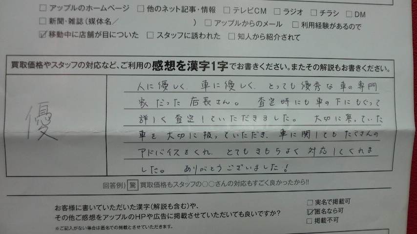査定時も車の下にもぐって詳しく査定して頂きました。