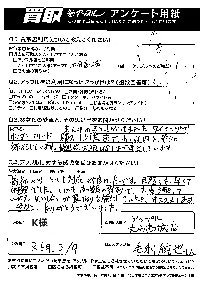 K様 車名:ホンダ フリード(H28年9月以降のハイブリッド含む)