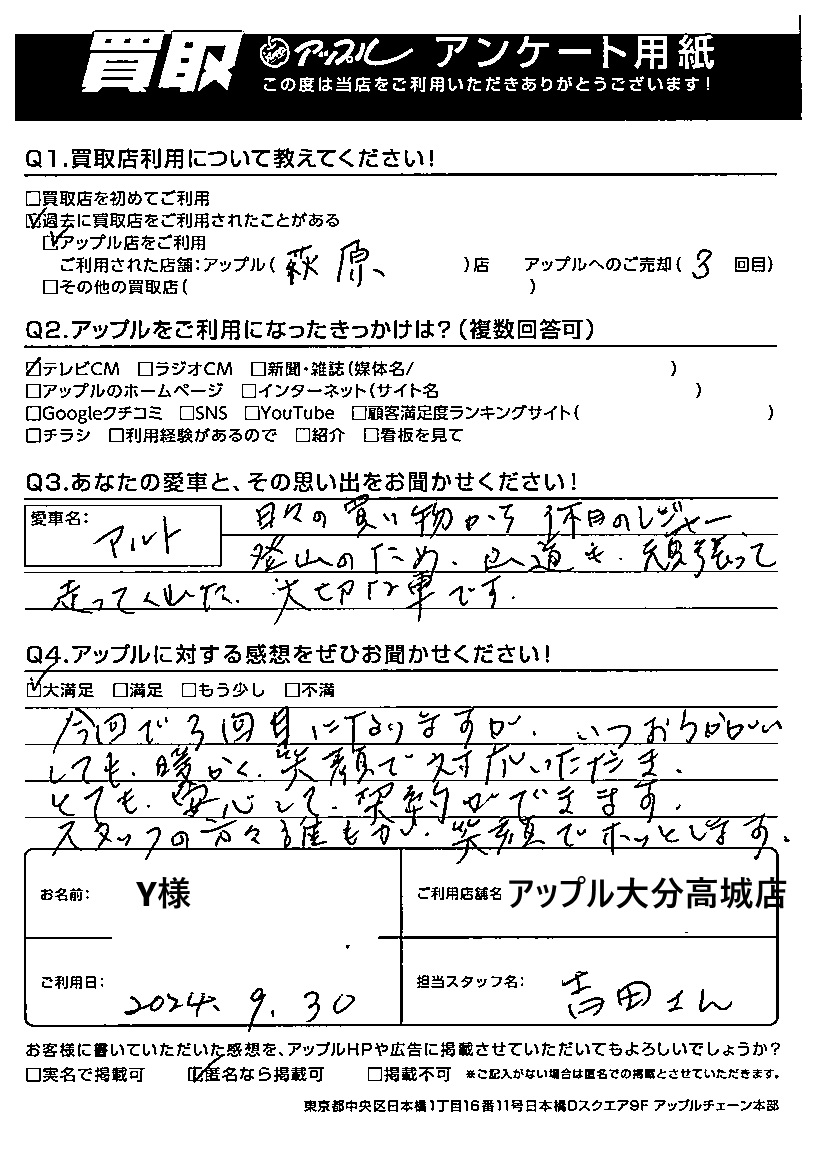 Y様 車名:スズキ アルト (2015年12月以降のワークス含む)