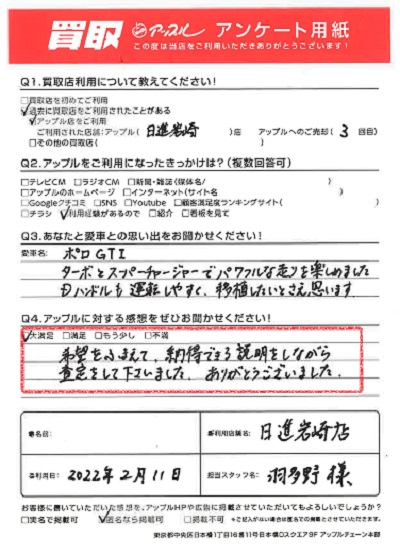 お車のご相談・ 査定だけでもOK! カンタン 入力 30秒 アップルがブランド買取始めました! お電話でも受付中! 受付時間09:30 ~ 18:30 0561-75-6616 お車のご相談・ 査定だけでもOK! カンタン 入力 30秒 アップルがブランド買取始めました! お電話でも受付中! 受付時間09:30 ~ 18:30 0561-75-6616 アップルがブランド買取始めました! お電話でも受付中! 受付時間09:30 ~ 18:30 0561-75-6616 店舗情報 在庫車 スタッフ紹介 ブログ お客様の声 キャンペーン 無料査定 click お客様の声 ご記入日: 2022/02/11 M様 車名:フォルクスワーゲン ポロ 満足度★★★★★希望をふまえて、納得できる説明をしながら査定をして下さいました。ありがとうございました。 前へ 次へ お客様の声一覧を見る