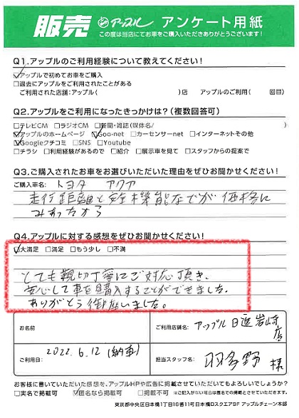 お車のご相談・ 査定だけでもOK! カンタン 入力 30秒 アップルがブランド買取始めました! お電話でも受付中! 受付時間09:30 ~ 18:30 0561-75-6616 お車のご相談・ 査定だけでもOK! カンタン 入力 30秒 アップルがブランド買取始めました! お電話でも受付中! 受付時間09:30 ~ 18:30 0561-75-6616 アップルがブランド買取始めました! お電話でも受付中! 受付時間09:30 ~ 18:30 0561-75-6616 店舗情報 在庫車 スタッフ紹介 ブログ お客様の声 キャンペーン 無料査定 click お客様の声 ご記入日: 2022/06/12 Y様 車名:トヨタ アクア 満足度★★★★★とても親切丁寧にご対応頂き、安心して車を購入することができました。ありがとう御座いました。 前へ 次へ お客様の声一覧を見る