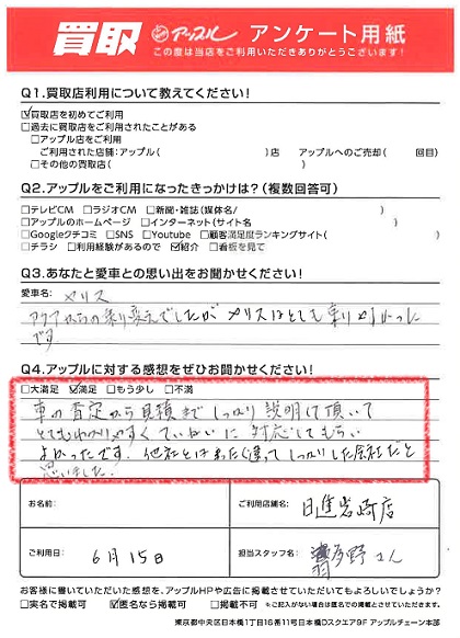 お車のご相談・ 査定だけでもOK! カンタン 入力 30秒 アップルがブランド買取始めました! お電話でも受付中! 受付時間09:30 ~ 18:30 0561-75-6616 お車のご相談・ 査定だけでもOK! カンタン 入力 30秒 アップルがブランド買取始めました! お電話でも受付中! 受付時間09:30 ~ 18:30 0561-75-6616 アップルがブランド買取始めました! お電話でも受付中! 受付時間09:30 ~ 18:30 0561-75-6616 店舗情報 在庫車 スタッフ紹介 ブログ お客様の声 キャンペーン 無料査定 click お客様の声 ご記入日: 2022/06/15 K様 車名:トヨタ ヤリス 満足度★★★★車の査定から見積までしっかり説明していただいてとてもわかりやすく丁寧に対応してもらいよかったです。他社とは全く違ってしっかりした会社だと思いました。 前へ 次へ お客様の声一覧を見る