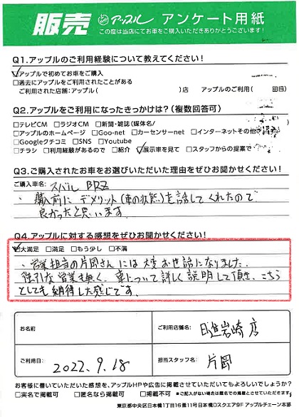 お車のご相談・ 査定だけでもOK! カンタン 入力 30秒 アップルがブランド買取始めました! お電話でも受付中! 受付時間09:30 ~ 18:30 0561-75-6616 お車のご相談・ 査定だけでもOK! カンタン 入力 30秒 アップルがブランド買取始めました! お電話でも受付中! 受付時間09:30 ~ 18:30 0561-75-6616 アップルがブランド買取始めました! お電話でも受付中! 受付時間09:30 ~ 18:30 0561-75-6616 店舗情報 在庫車 スタッフ紹介 ブログ お客様の声 キャンペーン 無料査定 click お客様の声 ご記入日: 2022/09/18 T様 車名:スバル BRZ 満足度★★★★★営業担当の片岡さんには大変お世話になりました。強引な営業もなく、車について詳しく説明してして頂き、こちらとしても納得した感じです。 前へ 次へ お客様の声一覧を見る