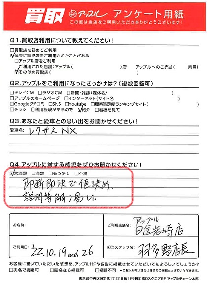 お車のご相談・ 査定だけでもOK! カンタン 入力 30秒 アップルがブランド買取始めました! お電話でも受付中! 受付時間09:30 ~ 18:30 0561-75-6616 お車のご相談・ 査定だけでもOK! カンタン 入力 30秒 アップルがブランド買取始めました! お電話でも受付中! 受付時間09:30 ~ 18:30 0561-75-6616 アップルがブランド買取始めました! お電話でも受付中! 受付時間09:30 ~ 18:30 0561-75-6616 店舗情報 在庫車 スタッフ紹介 ブログ お客様の声 キャンペーン 無料査定 click お客様の声 ご記入日: 2022/10/19 S様 車名:レクサス NX (国内仕様 右H) 満足度★★★★★即断即決で値決め。説明等解り易い。 前へ 次へ お客様の声一覧を見る