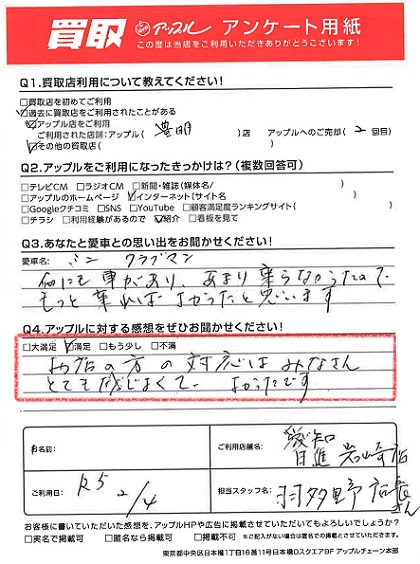 お車のご相談・ 査定だけでもOK! カンタン 入力 30秒 アップルがブランド買取始めました! お電話でも受付中! 受付時間09:30 ~ 18:30 0561-75-6616 お車のご相談・ 査定だけでもOK! カンタン 入力 30秒 アップルがブランド買取始めました! お電話でも受付中! 受付時間09:30 ~ 18:30 0561-75-6616 アップルがブランド買取始めました! お電話でも受付中! 受付時間09:30 ~ 18:30 0561-75-6616 店舗情報 在庫車 スタッフ紹介 ブログ お客様の声 キャンペーン 無料査定 click お客様の声 ご記入日: 2023/02/04 K様 車名:ミニ ミニクラブマン 満足度★★★★お店の方の対応はみなさんとても感じよくて、良かったです。 前へ 次へ お客様の声一覧を見る
