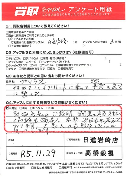 お車のご相談・ 査定だけでもOK! カンタン 入力 30秒 アップルがブランド買取始めました! お電話でも受付中! 受付時間09:30 ~ 18:30 0561-75-6616 お車のご相談・ 査定だけでもOK! カンタン 入力 30秒 アップルがブランド買取始めました! お電話でも受付中! 受付時間09:30 ~ 18:30 0561-75-6616 アップルがブランド買取始めました! お電話でも受付中! 受付時間09:30 ~ 18:30 0561-75-6616 店舗情報 在庫車 スタッフ紹介 ブログ お客様の声 キャンペーン 無料査定 click お客様の声 ご記入日: 2023/11/29 H様 車名:トヨタ プリウス(2023年3月~のPHVを含む) 満足度★★★★★髙橋店長のご説明、誠意のある対応、価格も満足。是非次回もと考えております。また、知人へも紹介したいと思っています。 前へ 次へ お客様の声一覧を見る