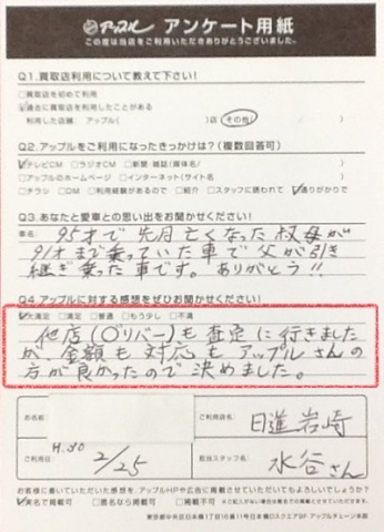 他店も査定に行きましたが、金額も対応もアップルさんの方が良かったので決めました。