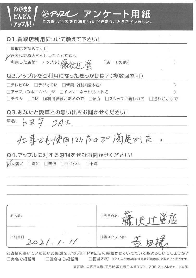 お車のご相談・ 査定だけでもOK! カンタン 入力 30秒 アップルがブランド買取始めました! お電話でも受付中! 受付時間10:00 ~ 18:30 0120-974-899 お車のご相談・ 査定だけでもOK! カンタン 入力 30秒 アップルがブランド買取始めました! お電話でも受付中! 受付時間10:00 ~ 18:30 0120-974-899 アップルがブランド買取始めました! お電話でも受付中! 受付時間10:00 ~ 18:30 0120-974-899 店舗情報 在庫車 スタッフ紹介 ブログ お客様の声 キャンペーン お得 無料査定 click お客様の声 ご記入日: 2021/01/11 O様 車名:トヨタ SAI Q.あなたと愛車との思い出をお聞かせください!A.仕事でも使用していたので満足でした。担当:吉田 前へ 次へ お客様の声一覧を見る