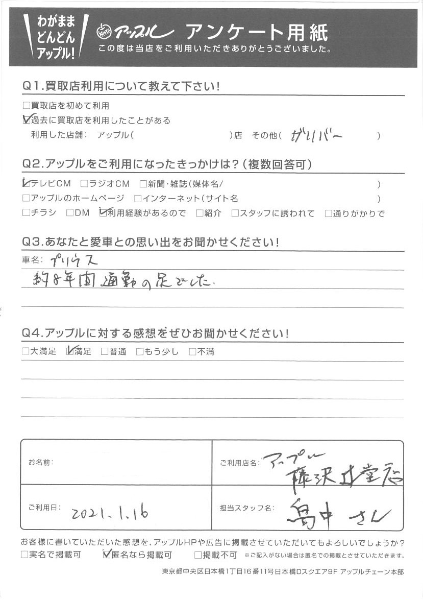 お車のご相談・ 査定だけでもOK! カンタン 入力 30秒 アップルがブランド買取始めました! お電話でも受付中! 受付時間10:00 ~ 18:30 0120-974-899 お車のご相談・ 査定だけでもOK! カンタン 入力 30秒 アップルがブランド買取始めました! お電話でも受付中! 受付時間10:00 ~ 18:30 0120-974-899 アップルがブランド買取始めました! お電話でも受付中! 受付時間10:00 ~ 18:30 0120-974-899 店舗情報 在庫車 スタッフ紹介 ブログ お客様の声 キャンペーン お得 無料査定 click お客様の声 ご記入日: 2021/01/16 匿名希望様 車名:トヨタ プリウス(2023年3月~のPHVを含む) Q.あなたと愛車との思い出をお聞かせください!A.約8年間通勤の足でした。担当:畠中 前へ 次へ お客様の声一覧を見る