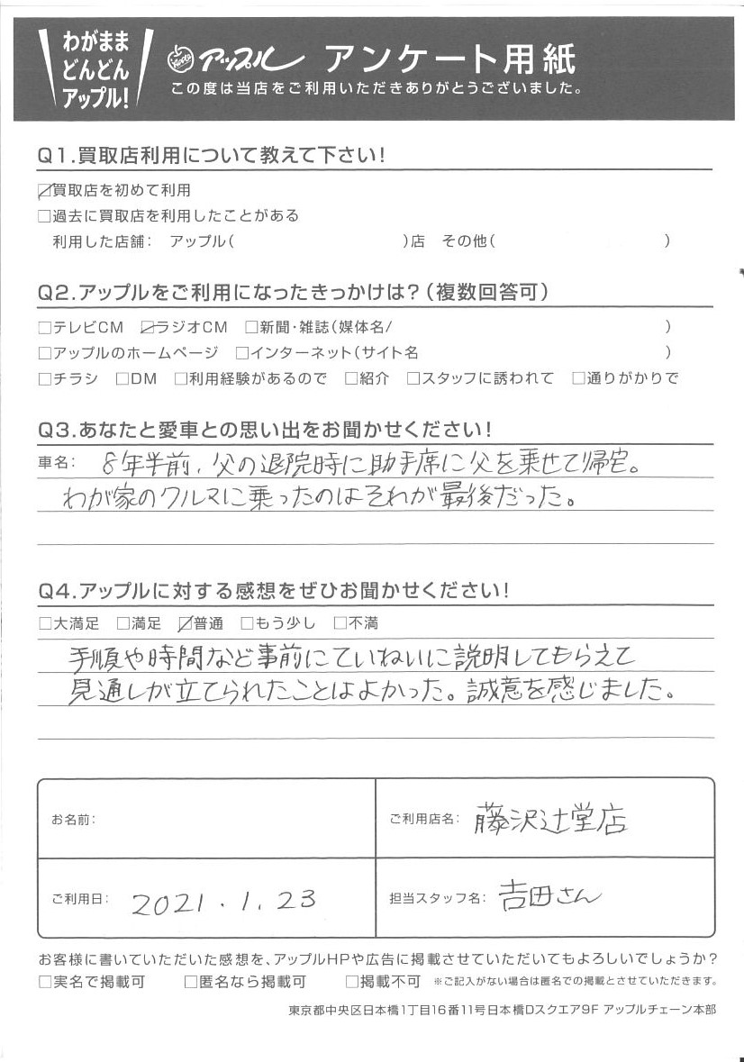 お車のご相談・ 査定だけでもOK! カンタン 入力 30秒 アップルがブランド買取始めました! お電話でも受付中! 受付時間10:00 ~ 18:30 0120-974-899 お車のご相談・ 査定だけでもOK! カンタン 入力 30秒 アップルがブランド買取始めました! お電話でも受付中! 受付時間10:00 ~ 18:30 0120-974-899 アップルがブランド買取始めました! お電話でも受付中! 受付時間10:00 ~ 18:30 0120-974-899 店舗情報 在庫車 スタッフ紹介 ブログ お客様の声 キャンペーン お得 無料査定 click お客様の声 ご記入日: 2021/01/23 匿名希望様 Q.あなたと愛車との思い出をお聞かせください!A.8年半前、父の退院時に助手席に父を乗せて帰宅。 わが家のクルマに乗ったのはそれが最後だった。Q.アップルに対する感想をぜひお聞かせください!A.手順や時間など事前にていねいに説明してもらえて 見通しが立てられたことはよかった。誠意を感じました。担当:吉田 前へ 次へ お客様の声一覧を見る