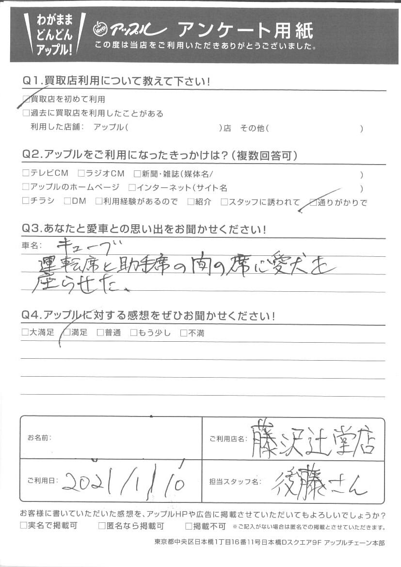 お車のご相談・ 査定だけでもOK! カンタン 入力 30秒 アップルがブランド買取始めました! お電話でも受付中! 受付時間10:00 ~ 18:30 0120-974-899 お車のご相談・ 査定だけでもOK! カンタン 入力 30秒 アップルがブランド買取始めました! お電話でも受付中! 受付時間10:00 ~ 18:30 0120-974-899 アップルがブランド買取始めました! お電話でも受付中! 受付時間10:00 ~ 18:30 0120-974-899 店舗情報 在庫車 スタッフ紹介 ブログ お客様の声 キャンペーン お得 無料査定 click お客様の声 ご記入日: 2021/01/10 S様 車名:日産 キューブ Q.あなたと愛車との思い出をお聞かせください!A.運転席と助手席の間の席に愛犬を座らせた。担当:後藤 前へ 次へ お客様の声一覧を見る