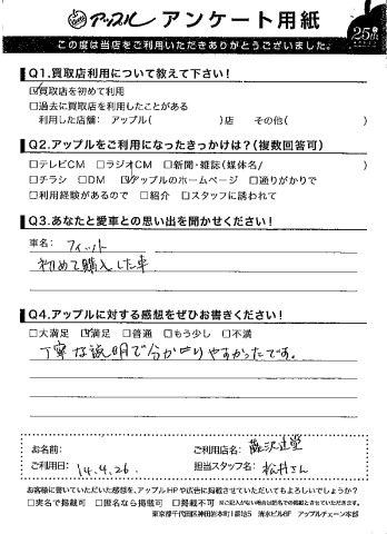 お車のご相談・ 査定だけでもOK! カンタン 入力 30秒 アップルがブランド買取始めました! お電話でも受付中! 受付時間10:00 ~ 18:30 0120-974-899 お車のご相談・ 査定だけでもOK! カンタン 入力 30秒 アップルがブランド買取始めました! お電話でも受付中! 受付時間10:00 ~ 18:30 0120-974-899 アップルがブランド買取始めました! お電話でも受付中! 受付時間10:00 ~ 18:30 0120-974-899 店舗情報 在庫車 スタッフ紹介 ブログ お客様の声 キャンペーン お得 無料査定 click お客様の声 ご記入日: 2014/08/04 T様 お車:フィットQ.愛車との思い出は?A.初めて購入した車Q.アップルの感想は?A.丁寧な説明で分かりやすかったです。 前へ 次へ お客様の声一覧を見る