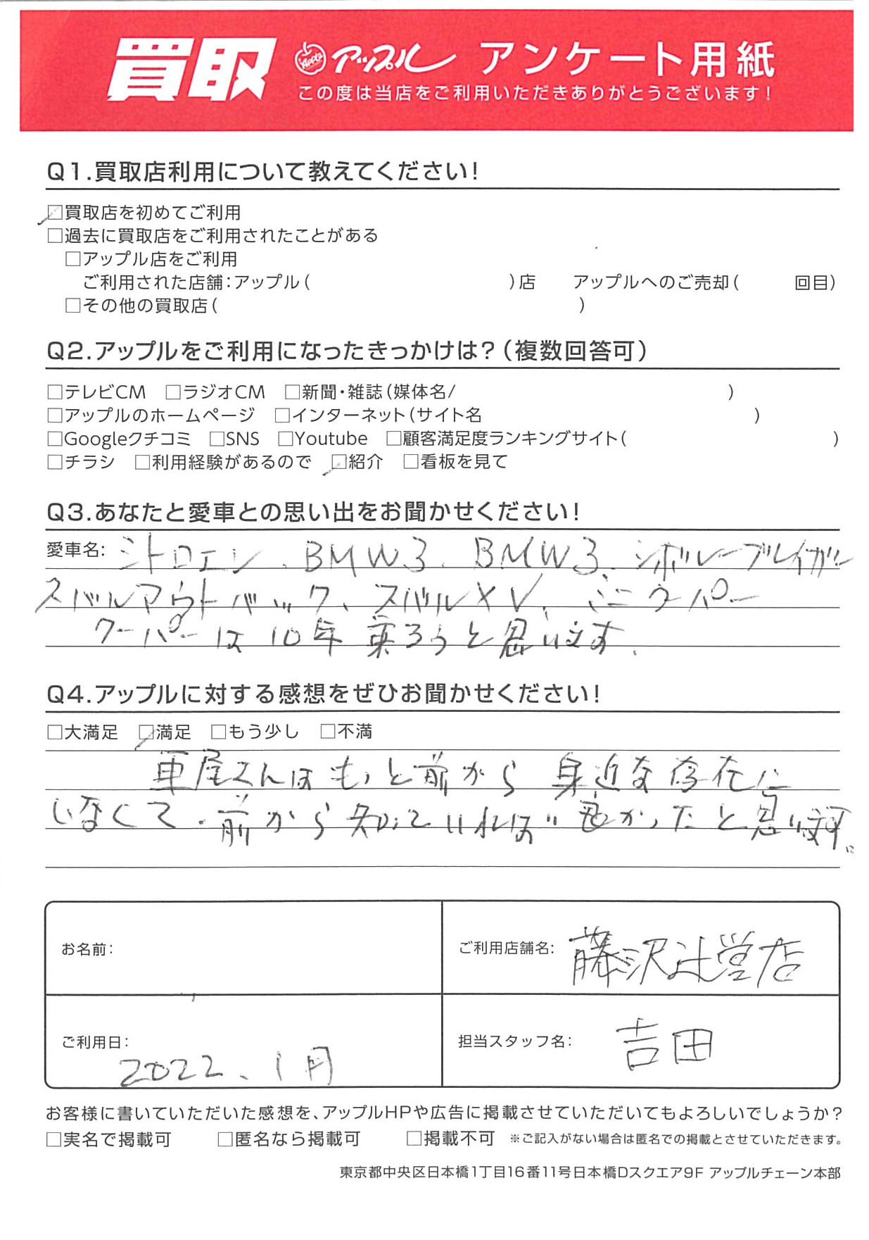 お車のご相談・ 査定だけでもOK! カンタン 入力 30秒 アップルがブランド買取始めました! お電話でも受付中! 受付時間10:00 ~ 18:30 0120-974-899 お車のご相談・ 査定だけでもOK! カンタン 入力 30秒 アップルがブランド買取始めました! お電話でも受付中! 受付時間10:00 ~ 18:30 0120-974-899 アップルがブランド買取始めました! お電話でも受付中! 受付時間10:00 ~ 18:30 0120-974-899 店舗情報 在庫車 スタッフ紹介 ブログ お客様の声 キャンペーン お得 無料査定 click お客様の声 ご記入日: 2022/01/21 I様 Q.あなたと愛車との思い出をお聞かせください!A.クーパーは10年乗ろうと思います。Q.アップルに対する感想をぜひお聞かせください!A.車屋さんはもっと前から身近な存在にいなくて、前から知っていれば 良かったと思います。担当:吉田 前へ 次へ お客様の声一覧を見る